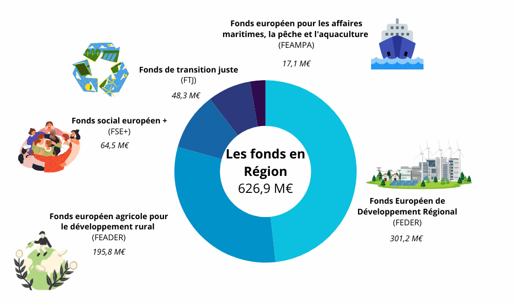 C'est l'autorité de gestion qui sélectionne les projets et qui est financièrement et juridiquement responsable de l'utilisation des fonds. Pour les Pays de la Loire, l'enveloppe pour la période 2021-2027 s'élève à 626,9 millions d'euros avec :